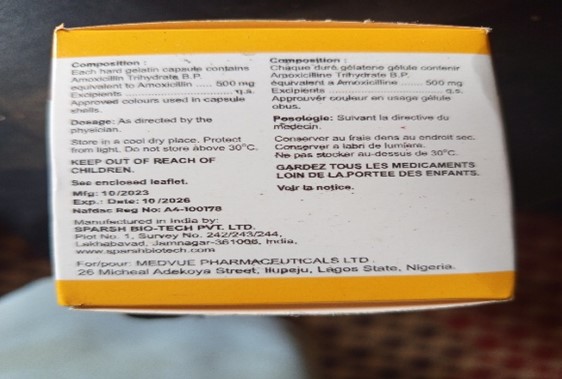 NAFDAC is alerting the public to the recall of Amoxivue (Amoxicillin) 500mg, with NAFDAC No. A4-100178 and Batch No. 322584, manufactured by Sparsh Bio-Tech Pvt, Ltd.