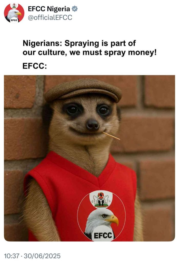 In its fight against Naira abuse, the anti-graft agency has brought charges against several Nigerians, including Bobrisky and Cubana Chief Priest. The agency shared the image above as a polite reminder that it is keeping an eye out for people who think that spraying Naira is a Nigerian custom and will not stop.