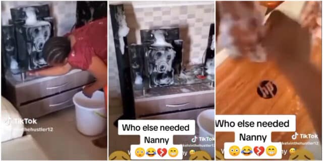 A video featuring a housemaid attempting to clean electronic gadgets, including a Tv set, sound system, and laptop, with a bucket of water, soap and a sponge has caused a buzz online.