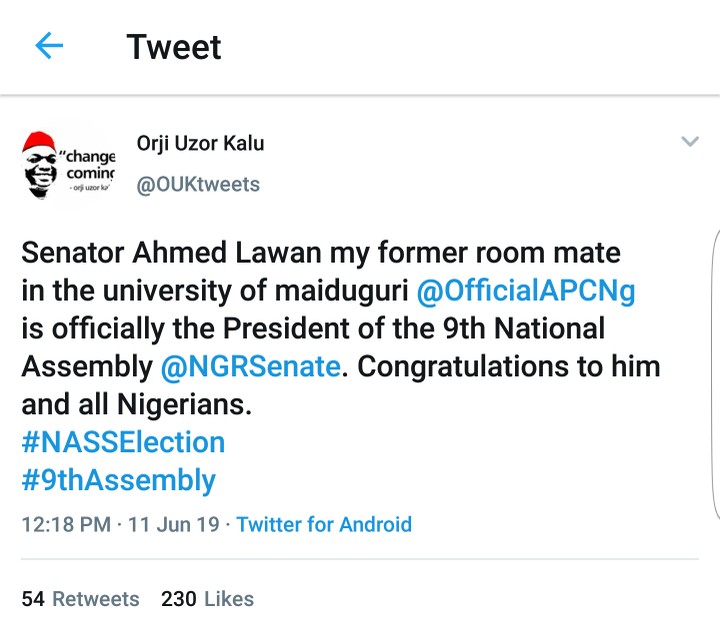 Dr. Kalu on his twitter handle @OUKtweets congratulated Ahmed Lawan,representing Yobe North on his emergence as the Senate President of the ninth National assembly. Lawan polled 79 votes to defeat his closest rival Ali Ndume who had 28 votes.