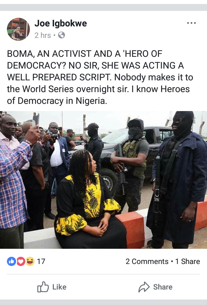 The chieftain of the ruling all progressives Congress (APC) ,Joe igbokwe has reacted the siege at the national Assembly on Tuesday . According to his post on facebook, he disagreed with new nomenclature “Activist and Hero of democracy ” given to the female lawmaker, Boma Goodhead , who dared the armed security operatives early Tuesday morning.