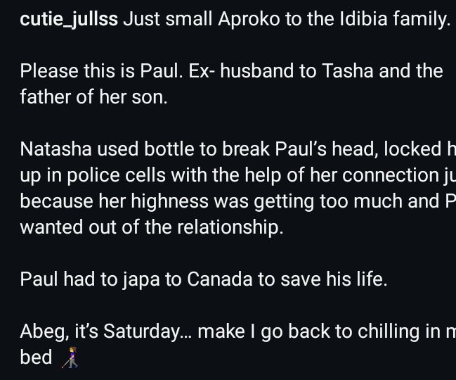 The post reads, “Just small Aproko to the Idibia family. Please this is Paul ex, husband to Tasha and the father of her son. Natasha used bottle to break Paul’s head, locked him up in police cells, with the help of her connection just because her highness was too much and Paul wanted out of the relationship”.