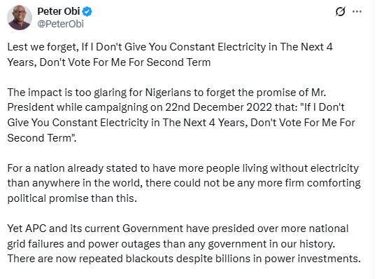 In his post, Obi argued that the APC and the president government have presided over more national grid failures and power outages than any government in Nigeria’s history.