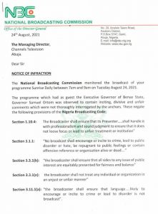 The letter read; The National Broadcasting Commission monitored the broadcast of your programme Sunrise Daily between 7am and 9am on Tuesday August 24, 2021.