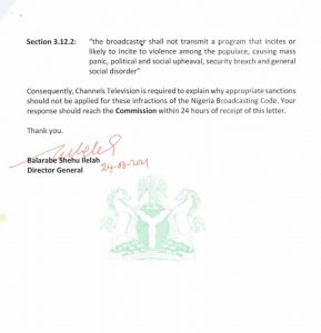 Consequently, Channels Television is required to explain why appropriate sanctions should not be applied for these infractions of the Nigeria Broadcasting Code. Your response should reach the Commission within 24 hours of receipt of this letter.