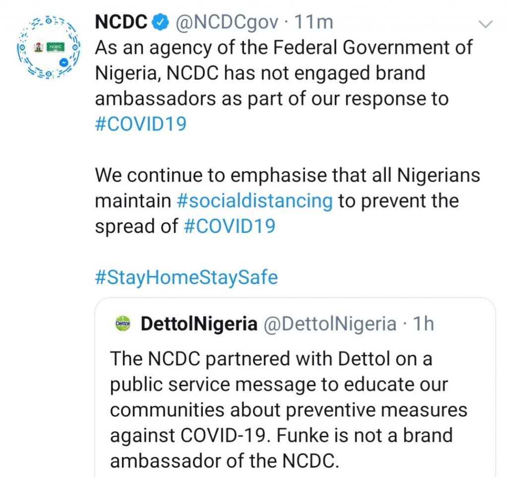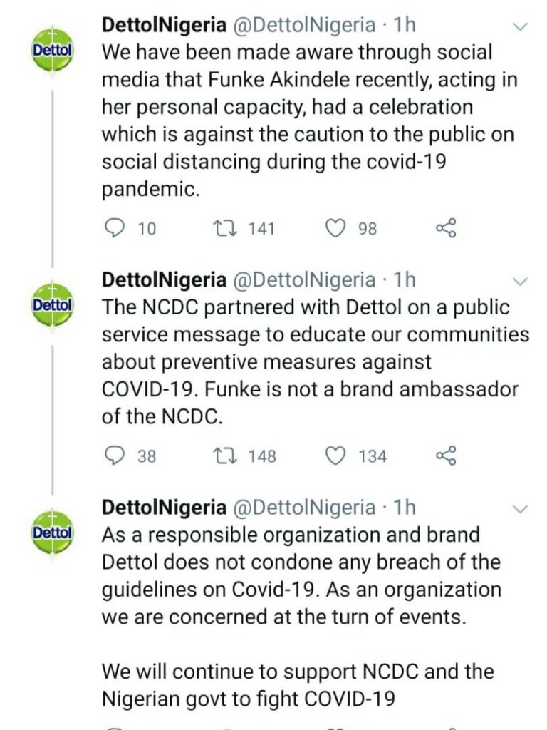Shortly after the news of her arrest broke, Dettol Nigeria on its Twiter page, said as a responsible organization, it does not condone any breach of the guidelines on Covid-19 and are concerned about the turn of events. NCDC on its part said it has not engaged brand ambassdors as part of its response to COVID-19.
