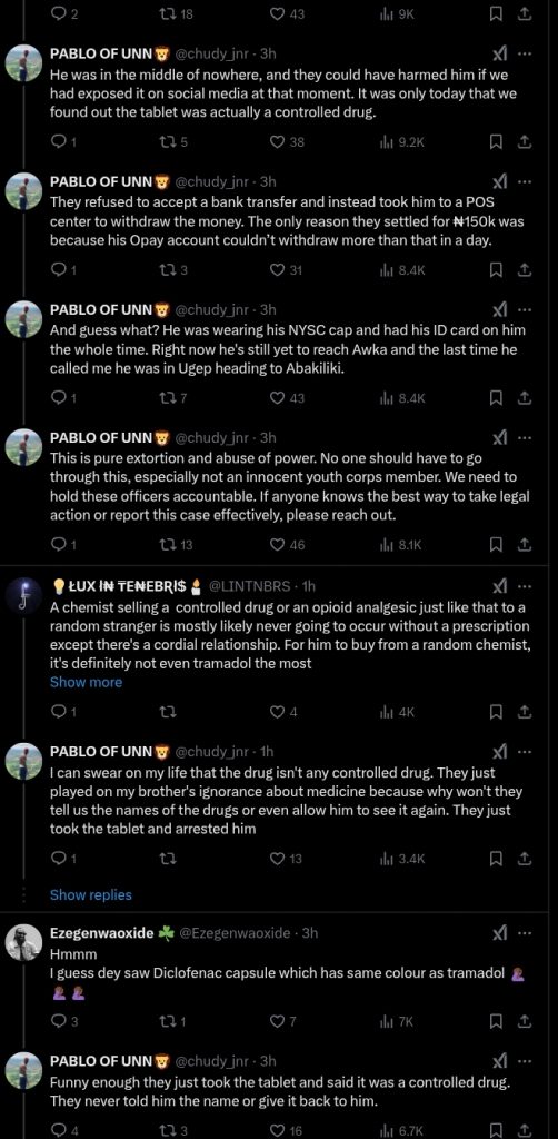 We had to pay ₦150K to bail him out. These @ndlea_nigeria officers handcuffed him and even asked the driver of the Onitsha South bus he boarded to leave him behind. He was stranded for three hours while we struggled to raise the funds.”