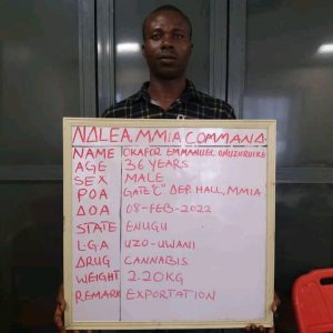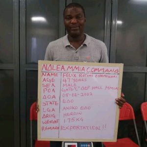At the Lagos airport, operatives on Tuesday 8th Feb arrested one Felix Rotimi Eshemokhai with 1.75kg heroin while trying to board Royal Air Maroc to Casablanca, Morocco while another trafficker, Okafor Emmanuel Onuzuruike was also nabbed same day during his bid to travel on RwandAir to Dubai with 2.2kg of Cannabis concealed in food stuff.