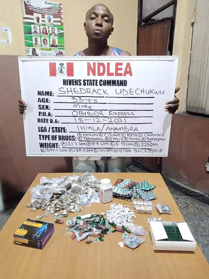 In similar raids across eight other states of Rivers, Kogi, Benue, Adamawa, Anambra, Edo, Ekiti and Ondo, over 4,000 kilograms of assorted illicit drugs were seized. On Saturday 18th Dec, during a routine stop and search exercise along Aba/Port Harcourt expressway, by Obigbo, operatives intercepted a consignment of Tramadol in a commercial Toyota Hiace bus, with a waybill addressed to one Shadrach Udechukwu. A follow up operation led to Udechukwus arrest and different quantities of Heroin, Cocaine, Methamphetamine, Cannabis Sativa, Tramadol, Exol-5, Swinol, and Diazepam recovered from him.