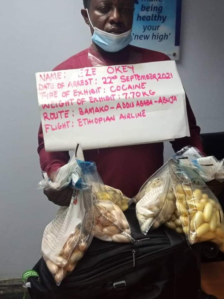 The 38-year-old Eze, from Orji River, in Oji-River Local Government area of Enugu State was arrested on Wednesday 22nd September, 2021 during an inward clearance of passengers on Ethiopian airline flight number 911 enroute Bamako-Addis Ababa- Abuja.