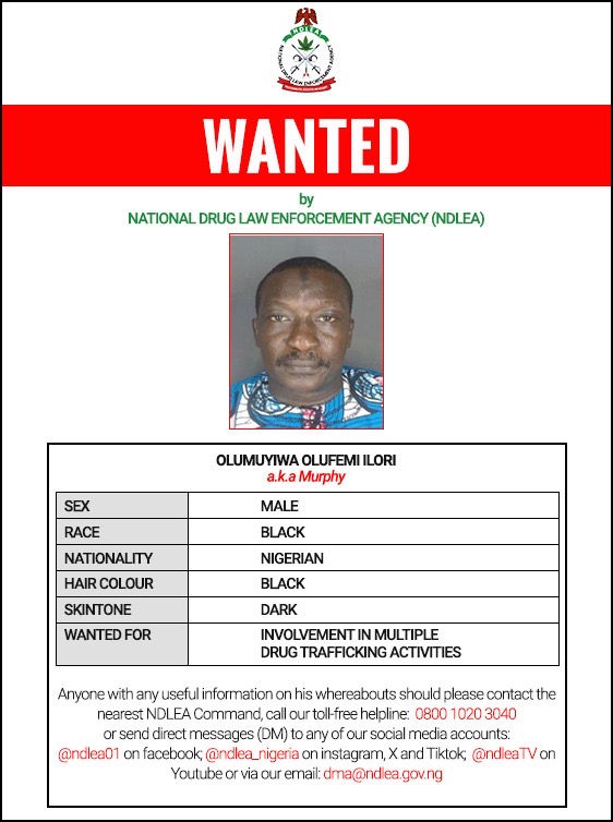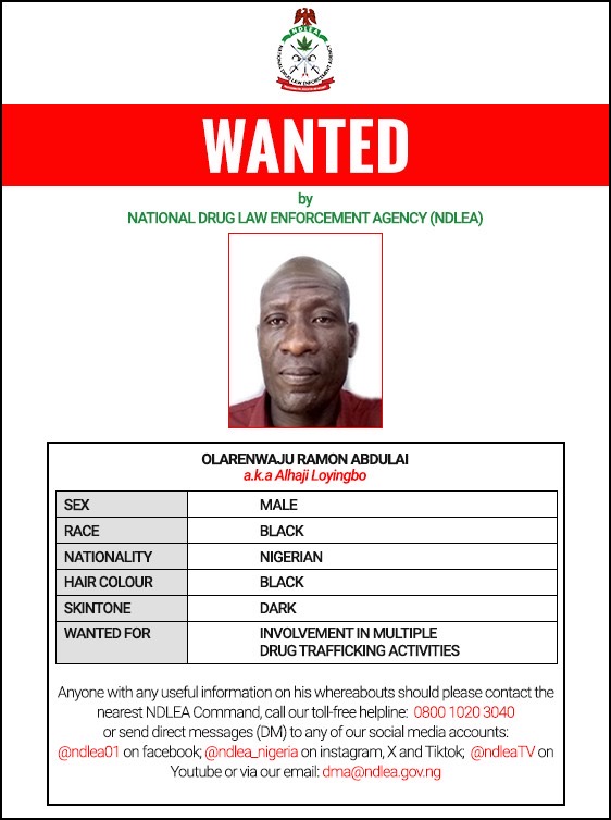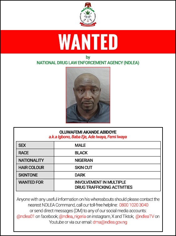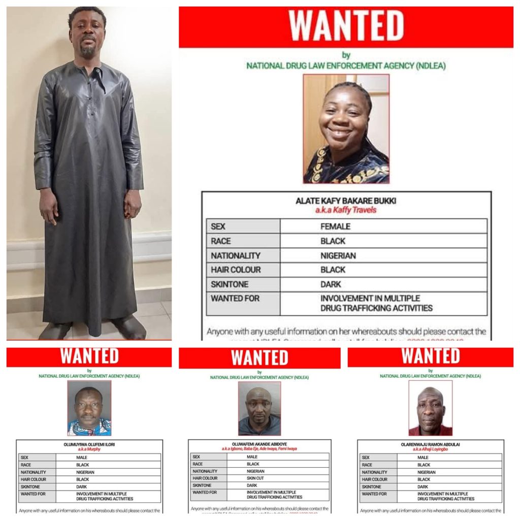 Those wanted for their alleged involvement in multiple drug trafficking activities include: Olarenwaju Ramon Abdulai (a.k.a Alhaji Loyingbo); Oluwafemi Akande Abidoye (a.k.a Igbono, Baba Eje, Ade Iwaya, Femi Iwaya); Olumuyiwa Olufemi Ilori (a.k.a Murphy) and Alate Kafy Bakare Bukki of Kaffy Travels.