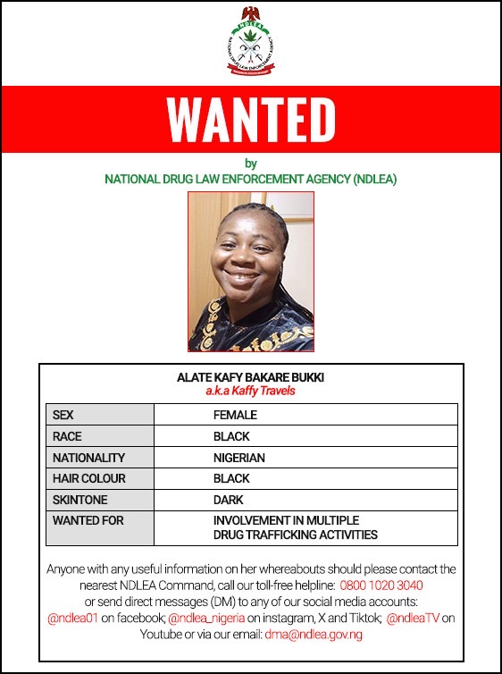 “That an Order declaring one Alate Kafy Zakare Bukki of Kaffy Travels wanted by a public notice with her photograph conspicuously displayed, who is presently at large for her involvement in the drug trafficking activities with Suleiman Aremu Ganiu a.k.a ‘Barryshine’, ‘Ejeoto’ is hereby granted.”