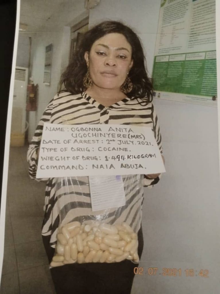 Operatives of the National Drug Law Enforcement Agency, NDLEA, have arrested a Nigerian woman based in Brazil, Mrs. Anita Ugochinyere Ogbonna, at the Nnamdi Azikiwe International Airport, NAIA, Abuja, with 100 pellets of cocaine concealed in her private part and handbag, IgbereTV reports.