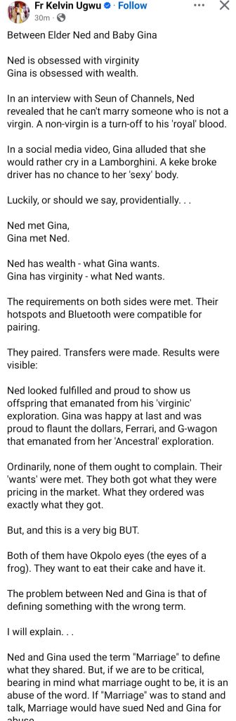 Reacting to the marriage crisis the couple is currently facing, Fr. Kelvin Ugwu said Ned was looking for a virgin and Regina was looking for wealth and they both got together with each other for that reason.