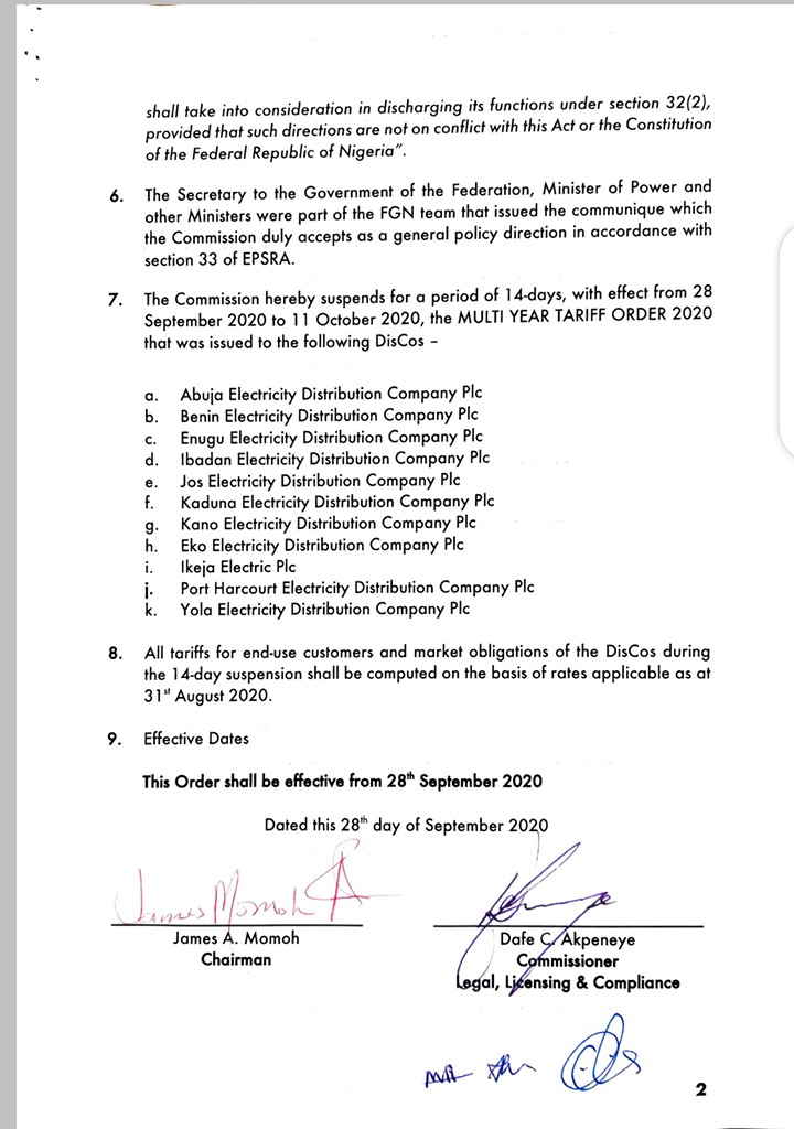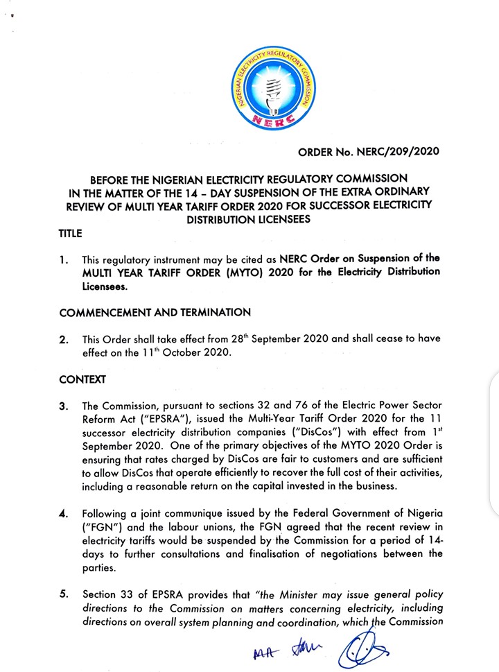The Nigerian Electricity Regulatory Commission on Tuesday night issued an order suspending the September 1, 2020 hike in electricity tariffs for 14 days.