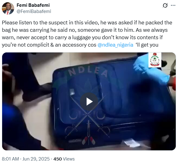 Femi Babafemi, the agency spokesperson, disclosed in a post on X that a man was recently arrested for picking up a piece of luggage without first reviewing its contents. After he was apprehended, it was discovered that the luggage contained some hard drugs.