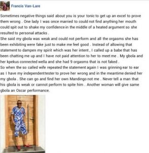 Francis Van-Lare, a US-based Nigerian businessman took to Facebook to warn women to desist from telling men that they cannot satisfy them s3xually.