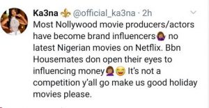 Ka3na had earlier made the statement in a Twitter post saying, “Most Nollywood movie producers/actors have become brand influencers. No latest Nigerian movies on Netflix. Bbn housemates don open their eyes to influencing money. It’s not a competition. Y’all make us good holiday movies, please.”