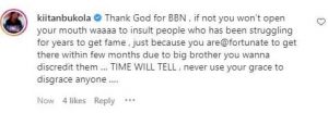 “Thank God for BBN, if not you won’t open your mouth waaaa to insult people who have been struggling for years to get fame, just because you are@fortunate to get there within few months due to big brother you wanna discredit them … TIME WILL TELL , never use your grace to disgrace anyone,” she wrote.