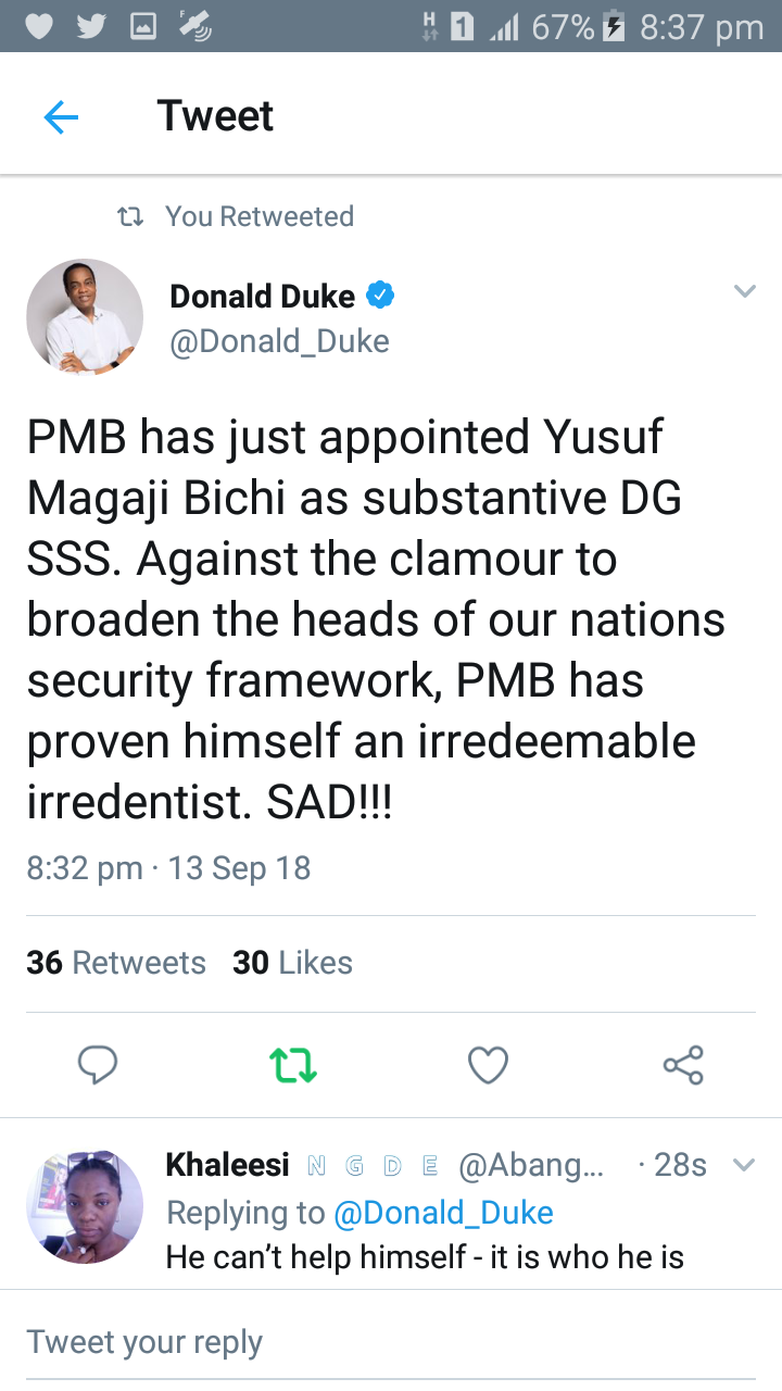 PMB has just appointed Yusuf Magaji Bichi as substantive DG SSS. Against the clamour to broaden the heads of our nations security framework, PMB has proven himself an irredeemable irredentist. SAD!!!