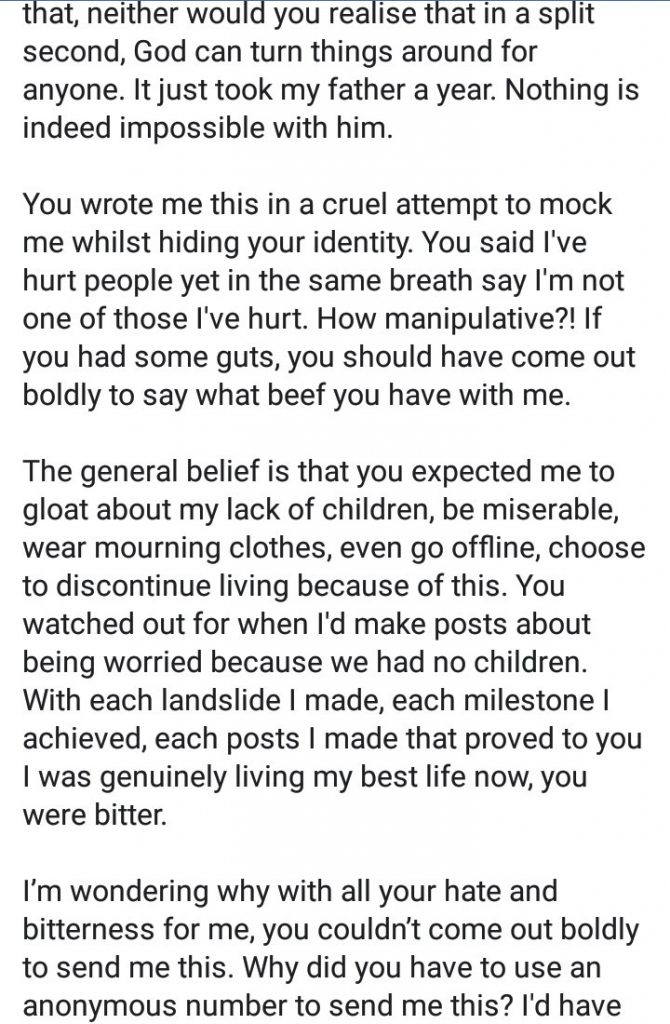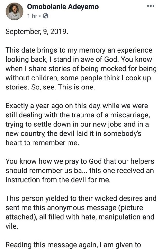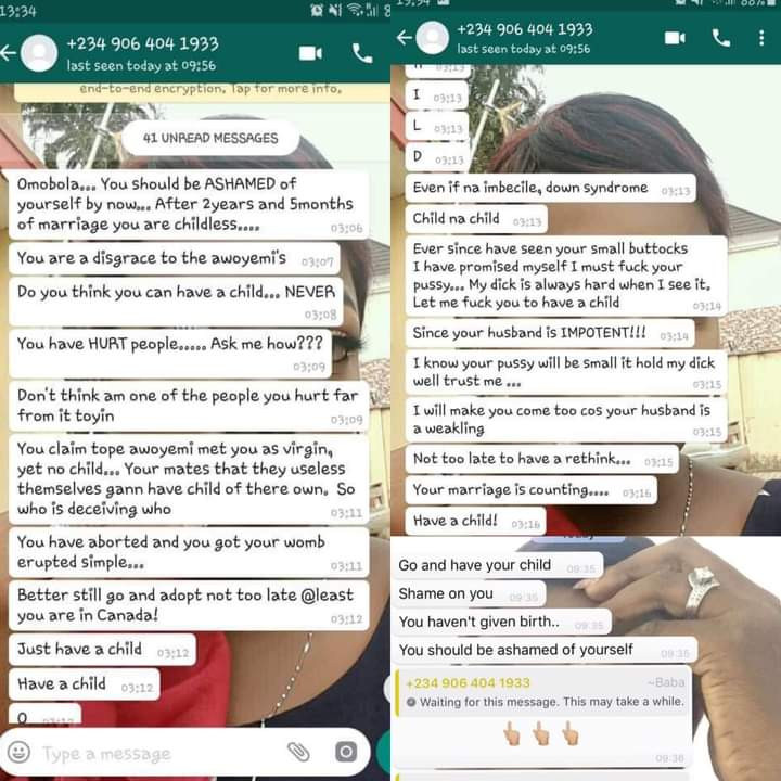 Omobolanle Adeyemo received the message on September 9, 2019. She had been married for 2 years and 5 months but had not given birth so someone sent her messages on WhatsApp to mock her.