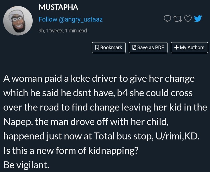 A woman paid a keke driver to give her change which he said he dsnt have, b4 she could cross over the road to find change leaving her kid in the Napep, the man drove off with her child, happened just now at Total bus stop, U/rimi,KD.