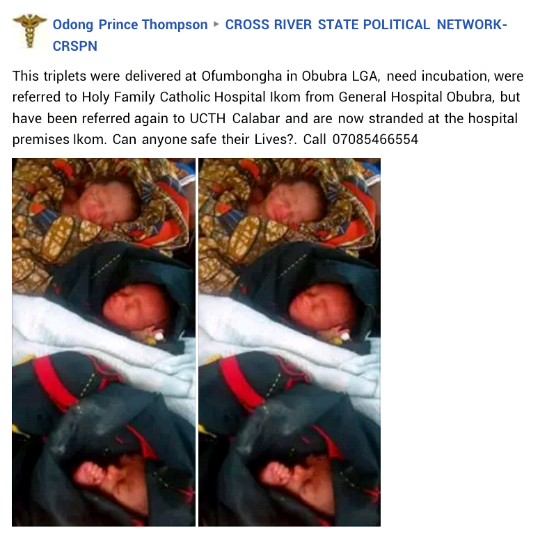 “This triplets were delivered at Ofumbongha in Obubra LGA, need incubation, were referred to Holy Family Catholic Hospital Ikom from General Hospital Obubra, but have been referred again to UCTH Calabar and are now stranded at the hospital premises Ikom. Can anyone safe their Lives?. Call 07085466554 parents number : 08057432962”