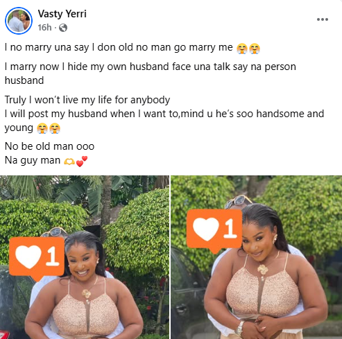 “I no marry una say I don old no man go marry me. I marry now I hide my own husband face una talk say na person husband. Truly I won’t live my life for anybody. I will post my husband when I want to, mind u he’s soo handsome and young. No be old man ooo. Na guy man,” she wrote in a Facebook post on Saturday, October 18