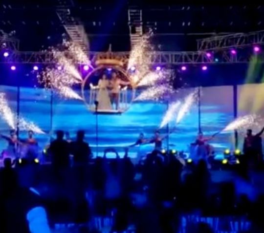 A video has emerged showing the moment a couple plunged 12ft from a giant swing during their elaborate wedding entrance.
