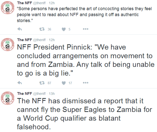 The Nigeria Football Federation took to twitter to dismiss media reports that it cannot fly the Super Eagles Players to Zambia for a World Cup qualifier match.