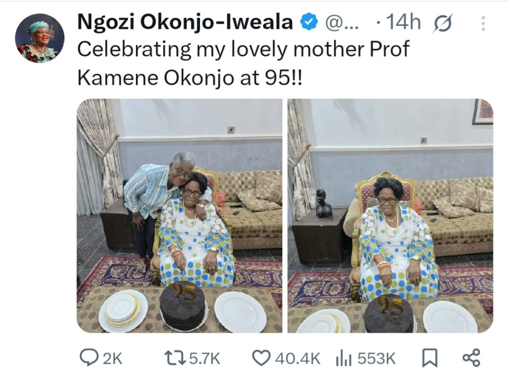 Ngozi Okonjo-Iweala took to X to celebrate her mother Prof. Kamene Okonjo on her birthday.