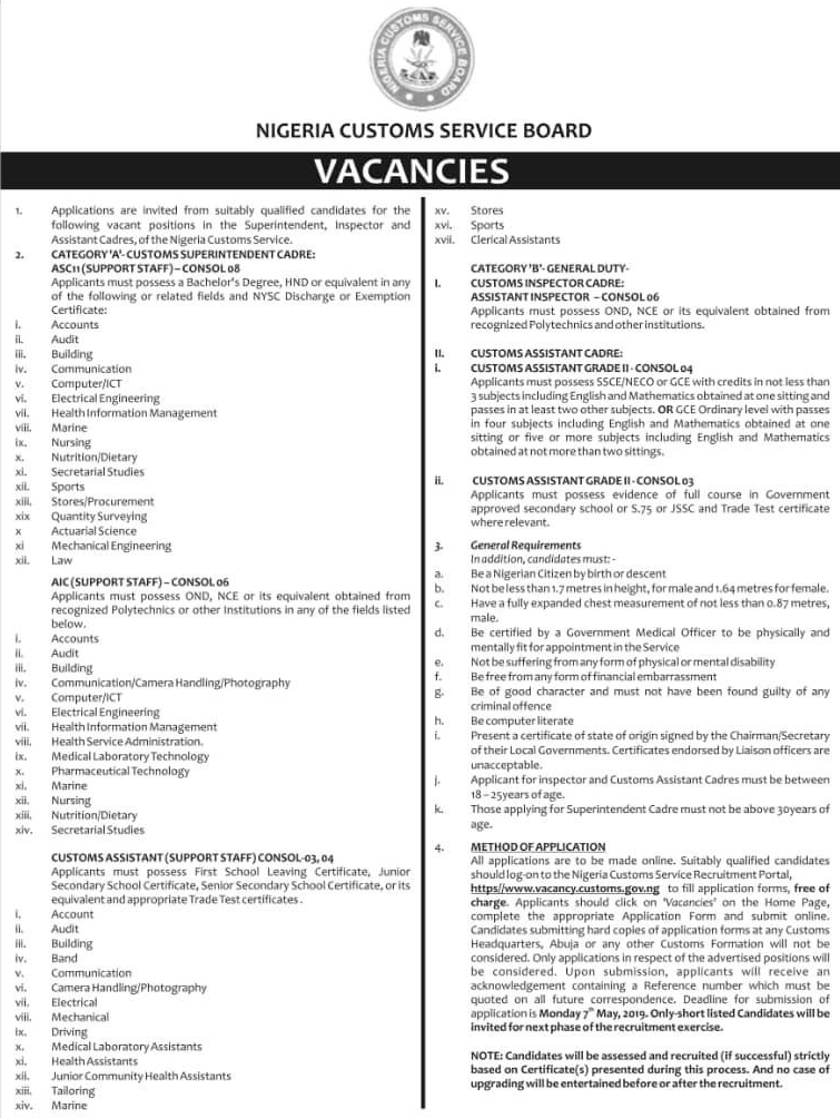 To properly inform the public, he said the information is being carried by seven national dailies from today while a web portal for applications has been created as a sub-domain of the NCS website.He gave the sub-site to be https://vacancy.customs.gov.ng adding that it will be opened for three weeks.