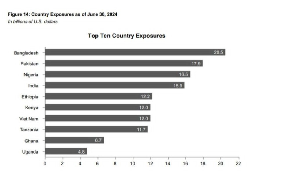 Other significant IDA borrowers include Ethiopia, whose exposure grew from $11.6 billion in 2023 to $12.2 billion in 2024, and Kenya and Vietnam, both with $12.0 billion in 2024.