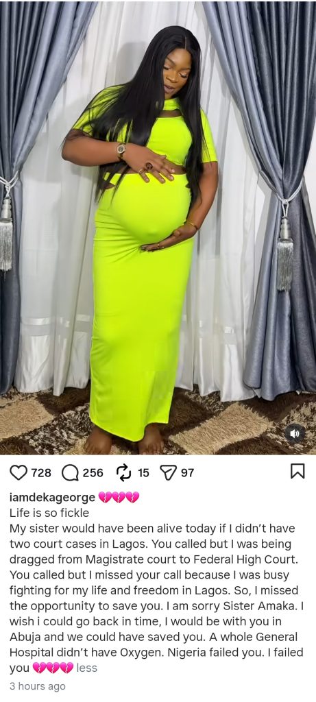 Sharing photos and a video from Amaka’s maternity photoshoot, Deka wrote: “Life is so fickle. My sister would have been alive today if I didn’t have two court cases in Lagos. You called but I was being dragged from Magistrate court to Federal High Court.