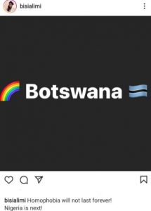 Reacting, Bisi shared a text photo with Botswana written on it, alongside the Botswana flag and the LGBTQ rainbow flag.