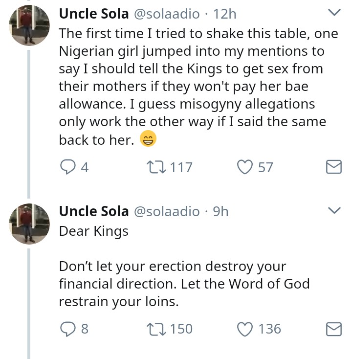 A Nigerian relationship expert on Twitter with the handle, Solaadio, has taken to his Twitter TL to advise men to keep off relationship that would make them to be paying monthly allowance to a girl.