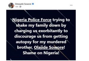 “‘Nigeria Police Force trying to shake my family down by charging us exorbitantly to discourage us from getting autopsy for my murdered brother, Olajide Sowore! Shame on Nigeria!”