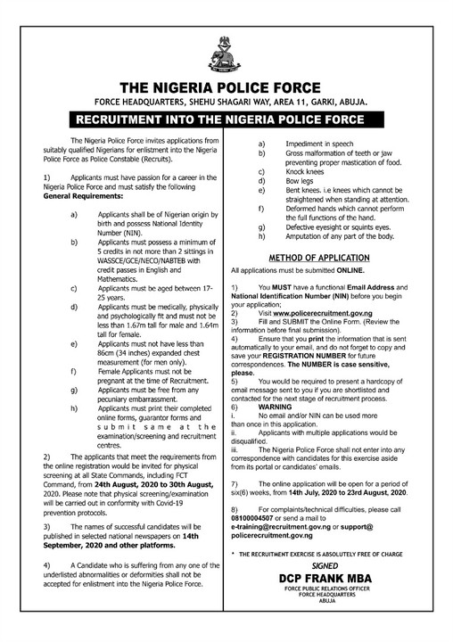 Mba noted that applicants that meet the requirements from the online registration would be invited for physical screening at all state commands, including FCT Command, from 24th August 2020 to 30th August 2020.