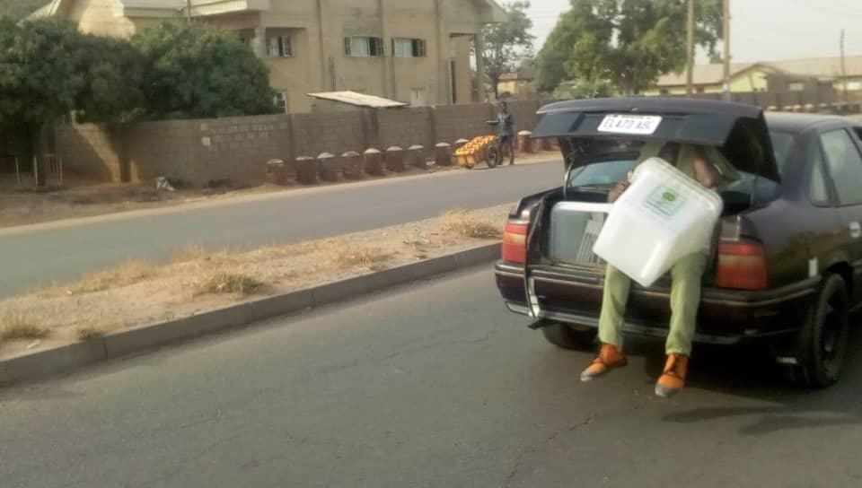 LIVE UPDATES: A Corp Member sitting in the booth of a car while conveying election materials along Bauchi-Dass Road