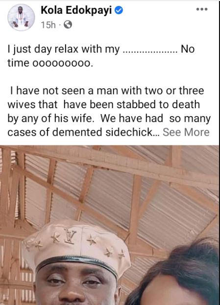“I have not seen a man with two or three wives that has been stabbed to death by any of his wife. We have had so many cases of demented sidechicks killing their boyfriends , man friends and even a man with one wife had been stabbed to death,” he said on Saturday.