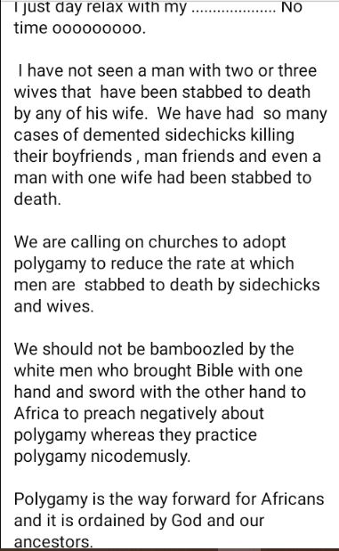 “We are calling on churches to adopt polygamy to reduce the rate at which men are stabbed to death by sidechicks and wives