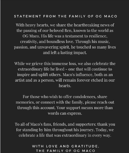“With heavy hearts, we share the heartbreaking news of the passing of our beloved Ben, known to the world as OG Maco.