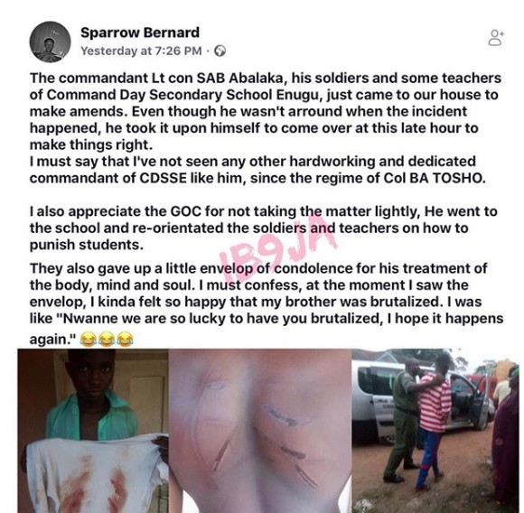 Nigerian army apologises, compensates CDSS student brutalized over incomplete uniform in Enugu State…