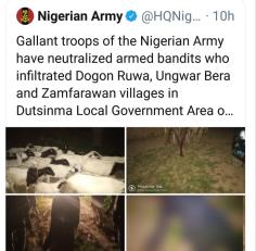 Gallant troops of the Nigeria Army have neutralised armed bandits who infiltrated Dogon Ruwa, Ungwar Bera and Zamfarawan villages in Dutsinma Local Government Area of Katsina State on 6 August 2020.