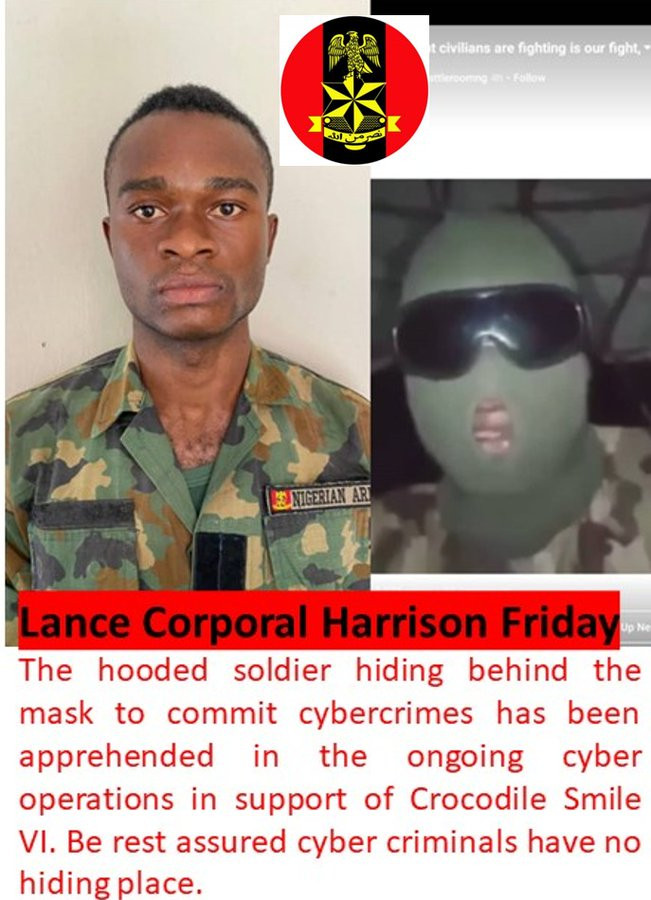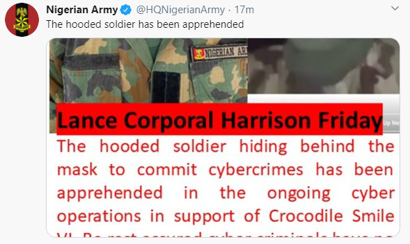 In a post shared on its Twitter handle this morning October 21, the Nigerian Army says Harrison carried out ‘cybercrime’ and that he has now been arrested.