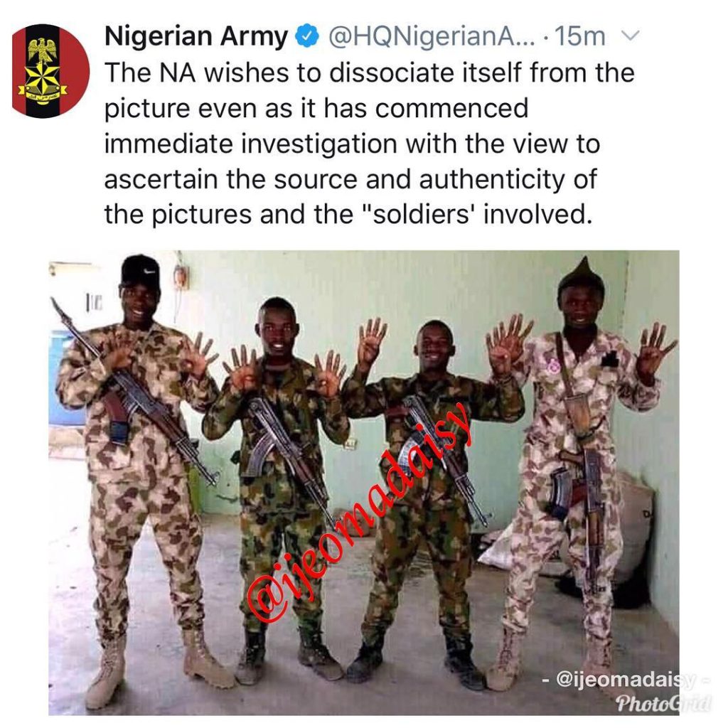 The Nigerian Army are investigating the authenticity of this photo. According to their statement . ‘If the outcome of the investigation comfirm this to be true, appropriate sanctions would be provided. NA of today under the command of Lt Gen Tukur Yusuf Buratai do not condone or encourage indiscipline and any form of professional misconduct.’