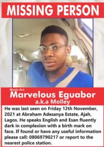 Nigerian artist, Marvelous Eguabor popularly known as Molley has been declared missing by his family members.