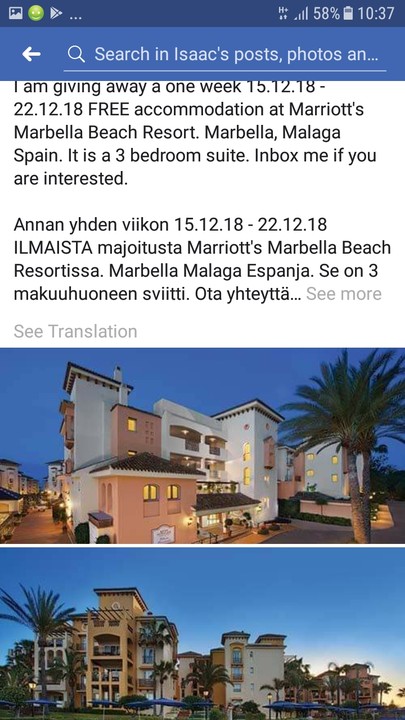 The luxury suite at Marriott’s Marbellla Beach Resorts in Malaga, Spain has standard 8 rooms with awesome scenery. According to him, he is offering the accommodation from 15th- 22nd December 2018.