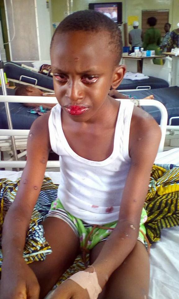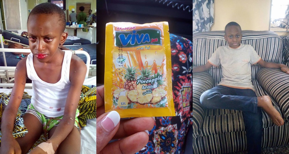 Nwadike revealed that her son, Chibuikem developed a reaction after consuming a pack of juice and he got so sick that his eyes were bloodshot red, his lips were badly bruised and bleeding, his skin was also bruised and bleeding.