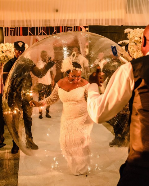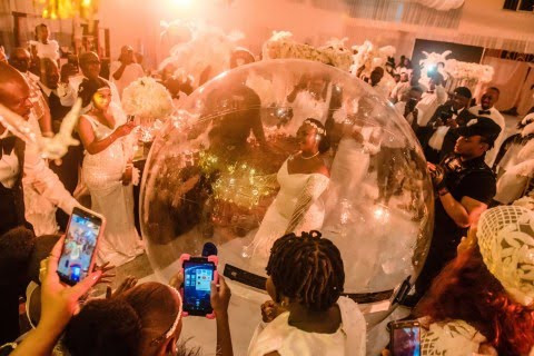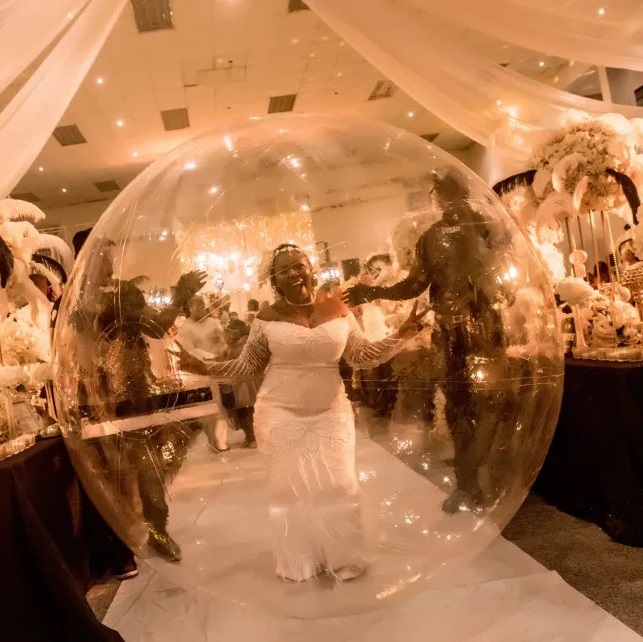 A Nigerian woman has made headlines after she arrived at her wedding anniversary in a giant inflatable balloon.   The woman, an Event planner identified as Reverence, from Nigeria, wanted to celebrate her tenth wedding anniversary with her husband, Joseph Efoma-Oruerio in style so came the idea.   She ordered a giant inflatable balloon to make her grand entrance into the venue, even if it cost her $500 and had to be shipped from Dubai.    At the reception, which held in Warri, Nigeria, Reverence shocked her guests as she rolled in with the transparent ball.   Reverence, 35, and husband Joseph, 51, invited friends and family to celebrate the special day with them.   She said: “The idea came from watching my kids playing in the pool with a balloon. I started thinking of how a bride could make an entrance into her wedding in a balloon. I searched online for life-size balloons and eventually bought one from Dubai for $500.”It was the first time the guests saw a bride in a balloon, they screamed so much with excitement. It was the highlight of the event.”